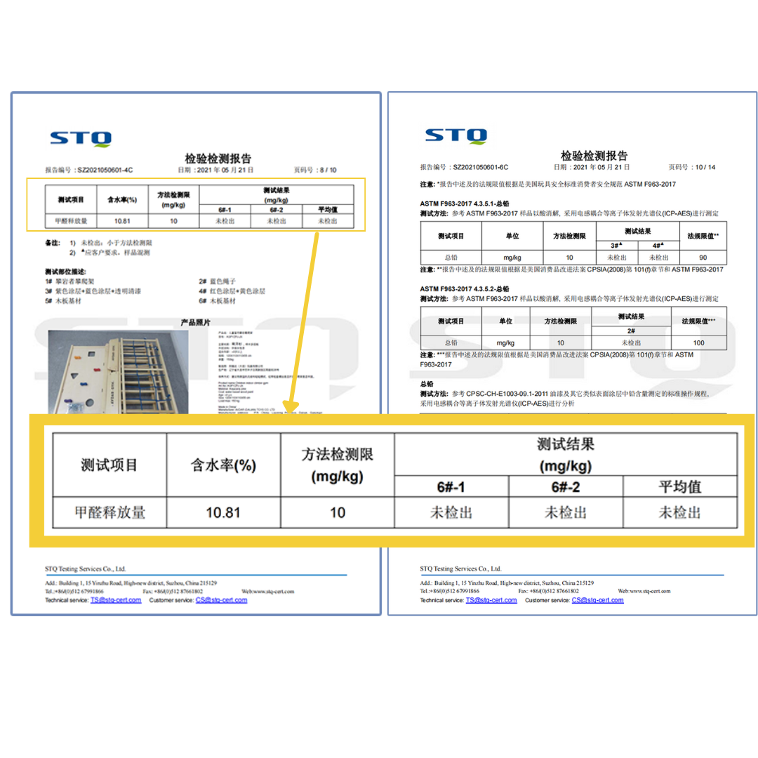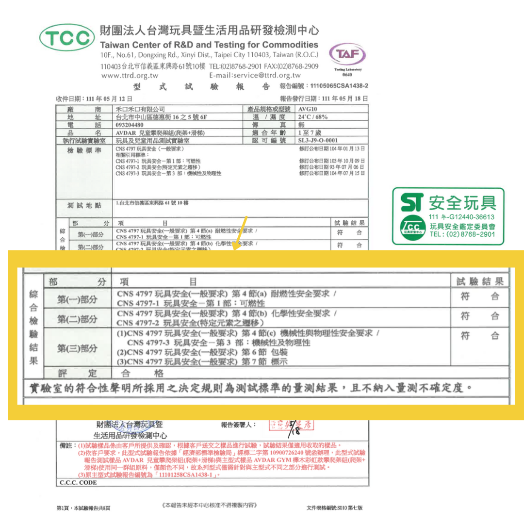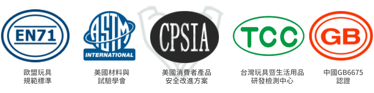 我們的木玩爬架都已拿到了歐盟玩具EN71、美國ASTM和CPSIA、中國玩具GB6675、台灣TCC玩具暨兒童用品研發中心的認證.其中包括甲醛、有害化學成分、重金屬轉移等父母特別關心的項目皆未檢出有害成分,孩子們可以安心遊玩