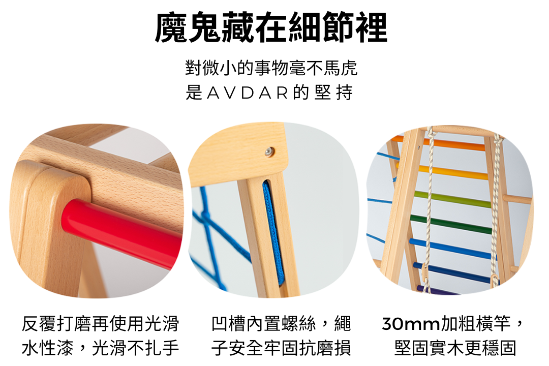 創立於2016年,當時剛剛成為父母的他們,想要替18個月大的寶貝找到俄羅斯家庭隨處可見的攀爬架,卻遍尋不到.自然質樸的觸感,可以讓孩子發揮想像力,鍛鍊體格的開放式木玩,在中國竟是一物難求.於是,手藝精湛的爸爸決定自己動手做.AVDAR攀爬架從此誕生.