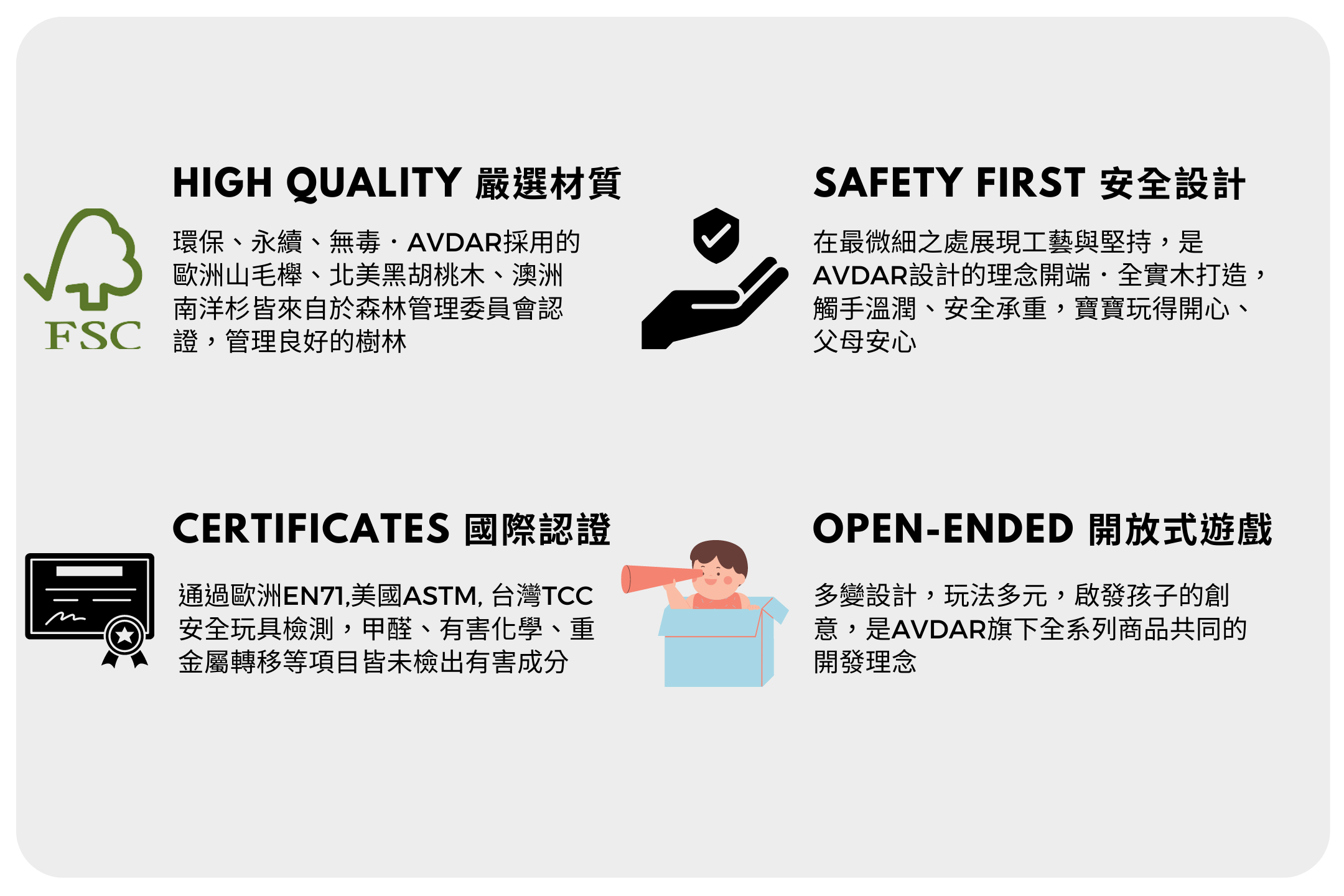 2021年底,AVDAR正式引進台灣,持續為孩子們提供安全,環保,有溫度的開放式玩具.