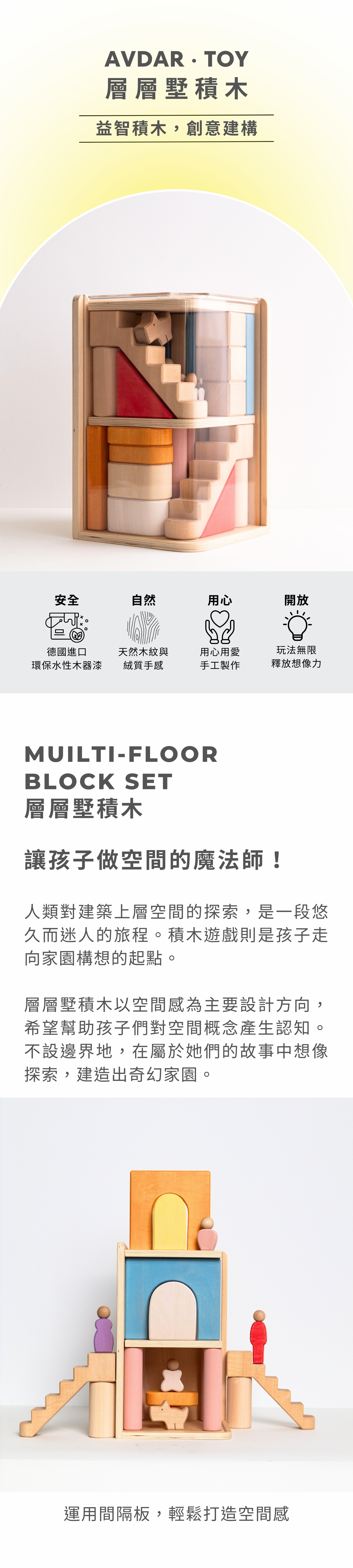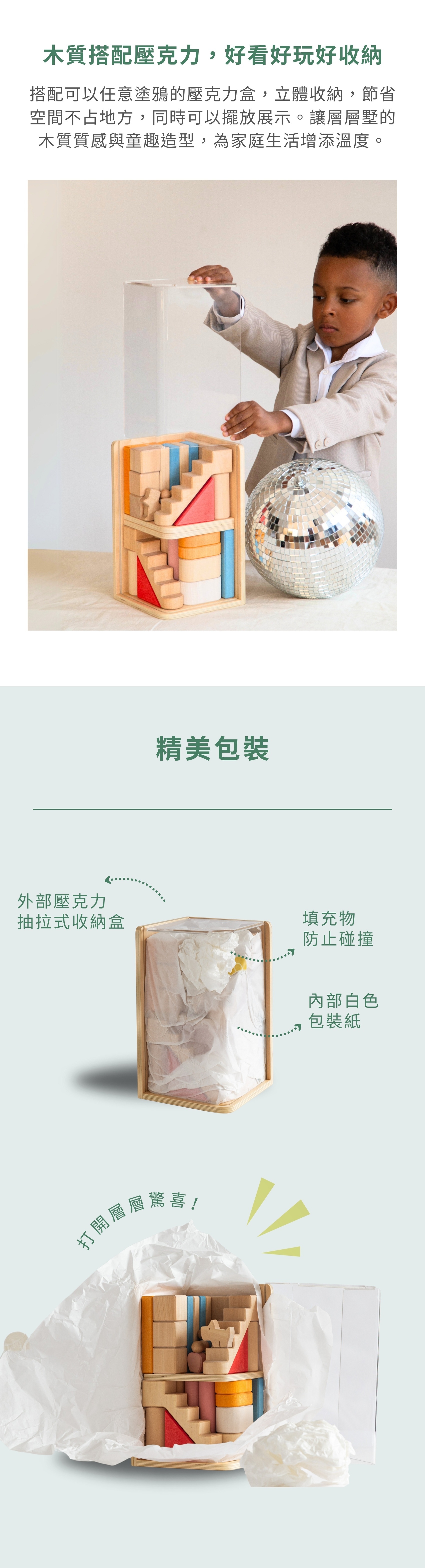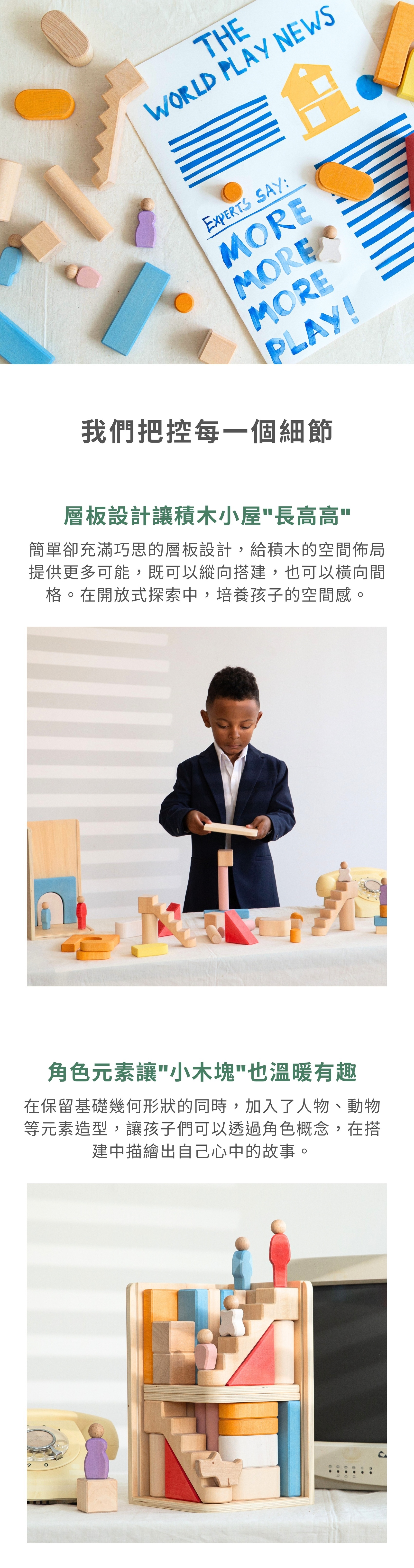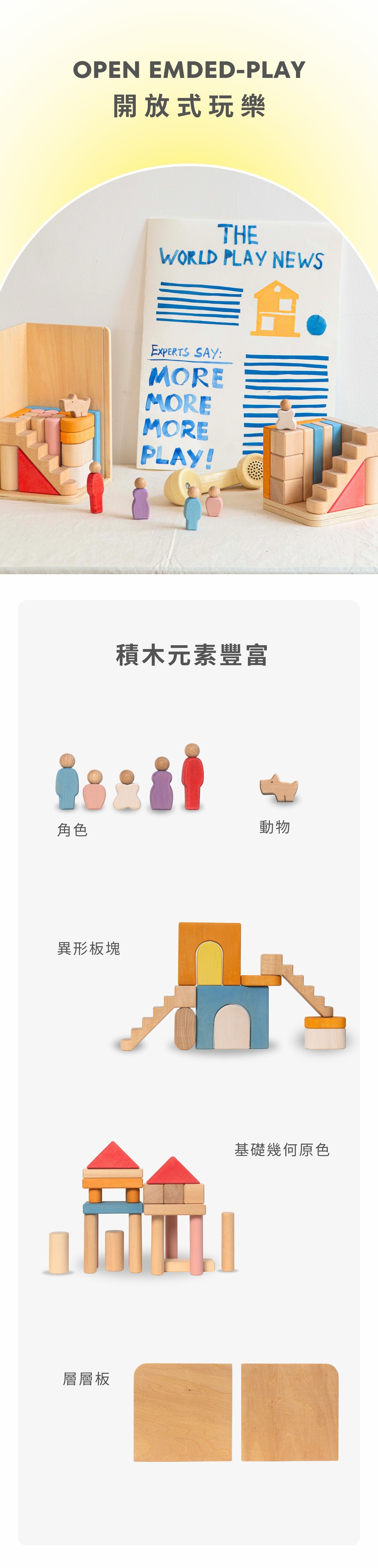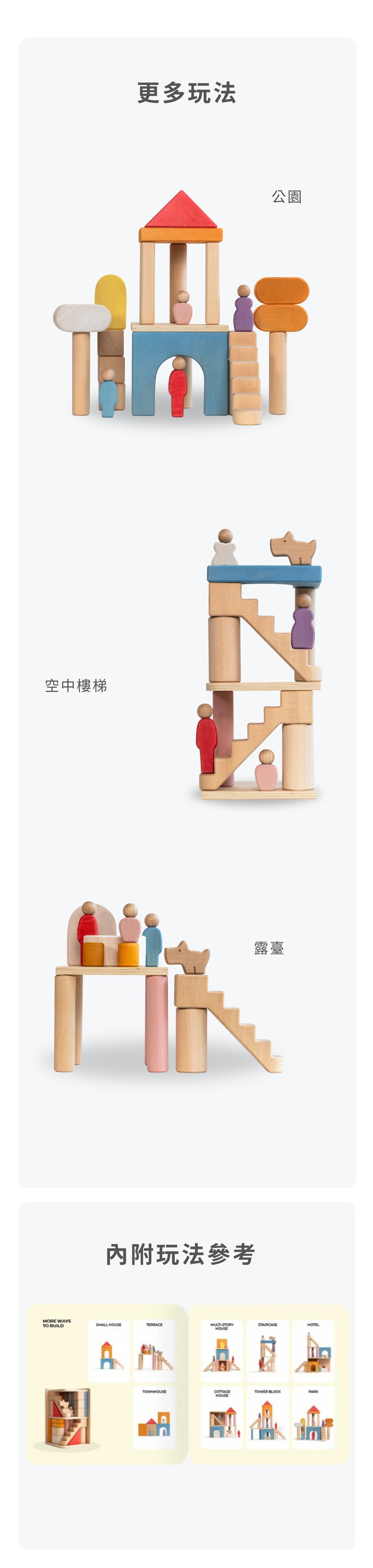 建立孩子的空間感,打造自己想像中的「家」。除了基礎幾何形狀,還有不規則的樓梯、拱門,以及人物、動物等積木。讓孩子不僅可以搭建,更可以加入家家酒劇情。培養社交發展。保留椴木絲絨,讓搭建更容易。且大顆粒,避免吞食危險。