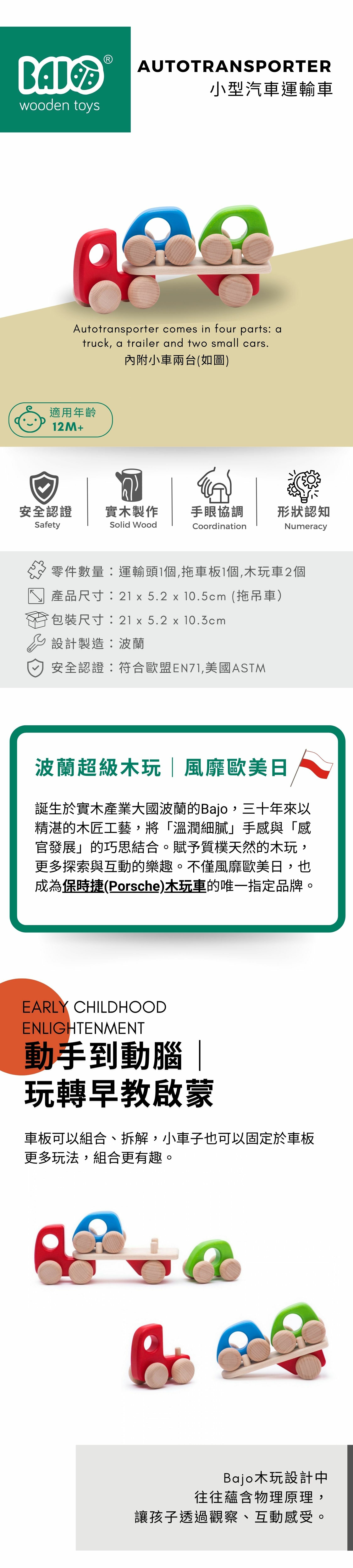 這款木製汽車運輸卡車設計精巧,可搭載多輛小車,幫助孩子認識交通運輸過程,提升手眼協調與邏輯思維,是角色扮演的最佳選擇。