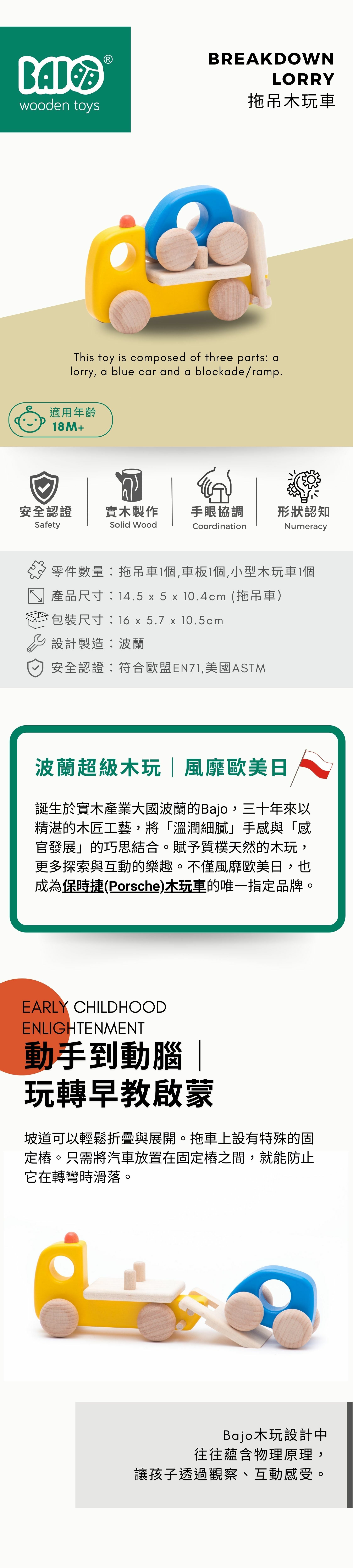孩子最愛的拖吊車來囉!模擬真實拖吊車,可轉動拖拉,幫助孩子在遊戲中認識交通工具的功能與合作精神,提升手眼協調與問題解決能力。