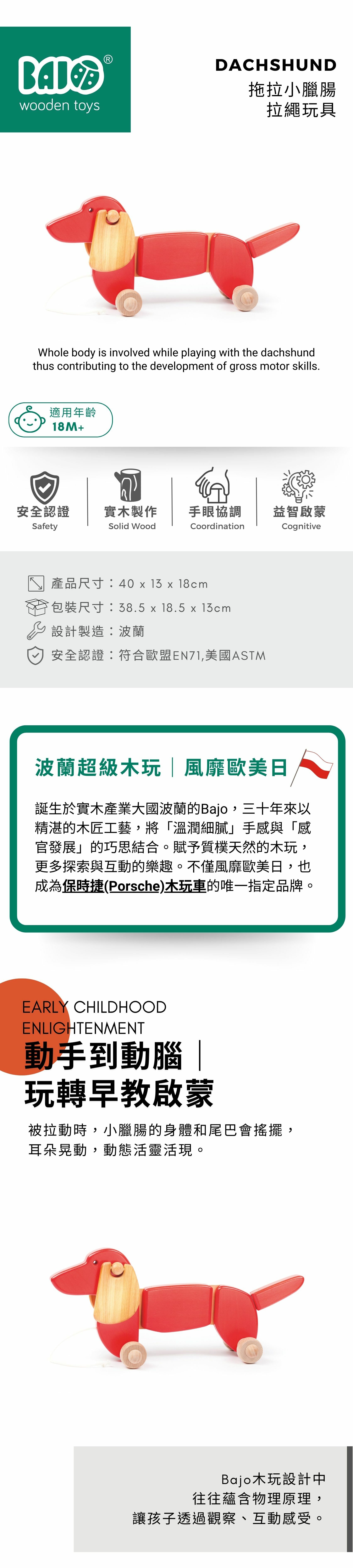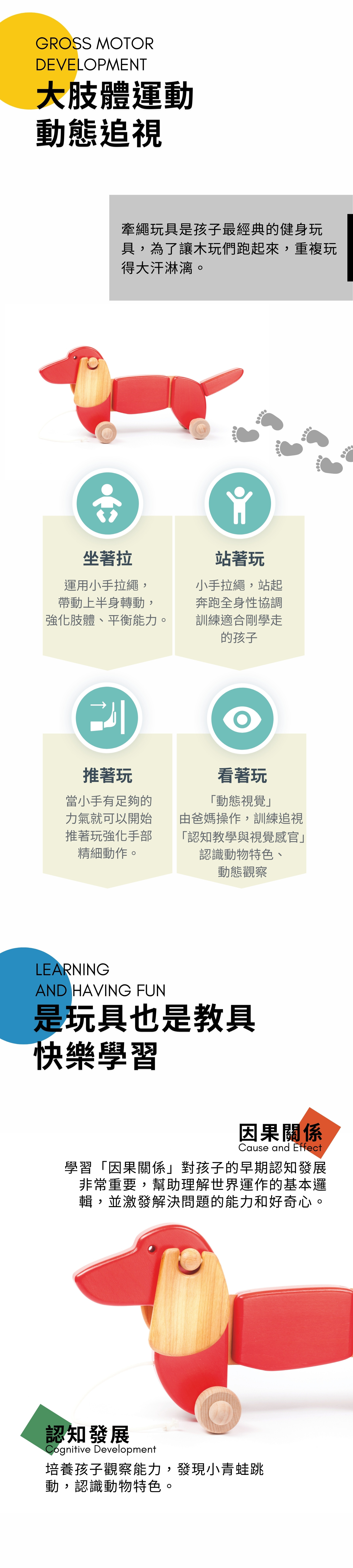 牽繩玩具是孩子最經典的健身玩具,為了讓木玩們跑起來,重複玩得大汗淋漓。可愛的小臘腸狗,耳朵、前腿、後腿、尾巴可動關節,更栩栩如生。
