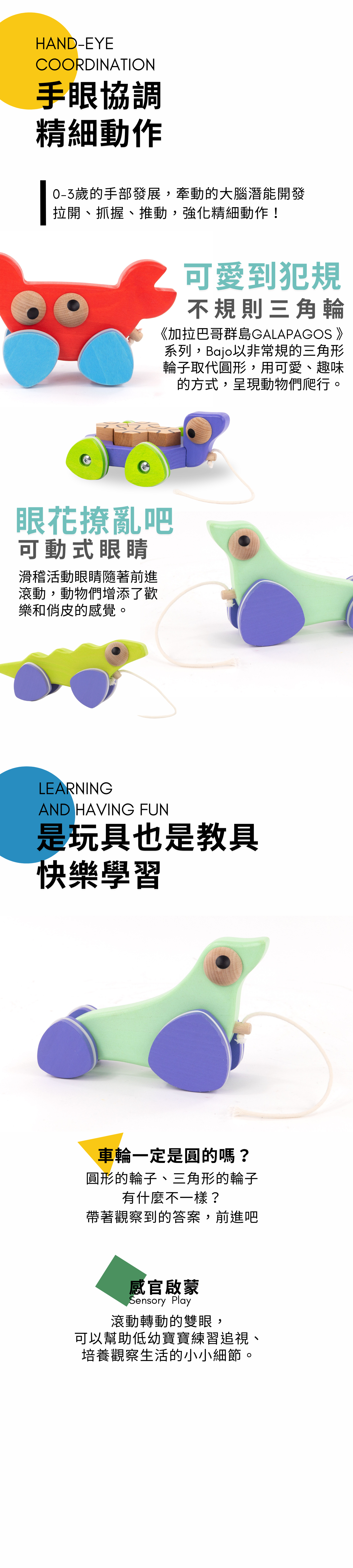 結合三角形輪子設計,模擬滑行的動態,大小輪子創造出自然行走感。靈動的360度滾動眼睛讓遊戲更生動,幫助孩子探索海洋生物的特性並提升動作協調能力。