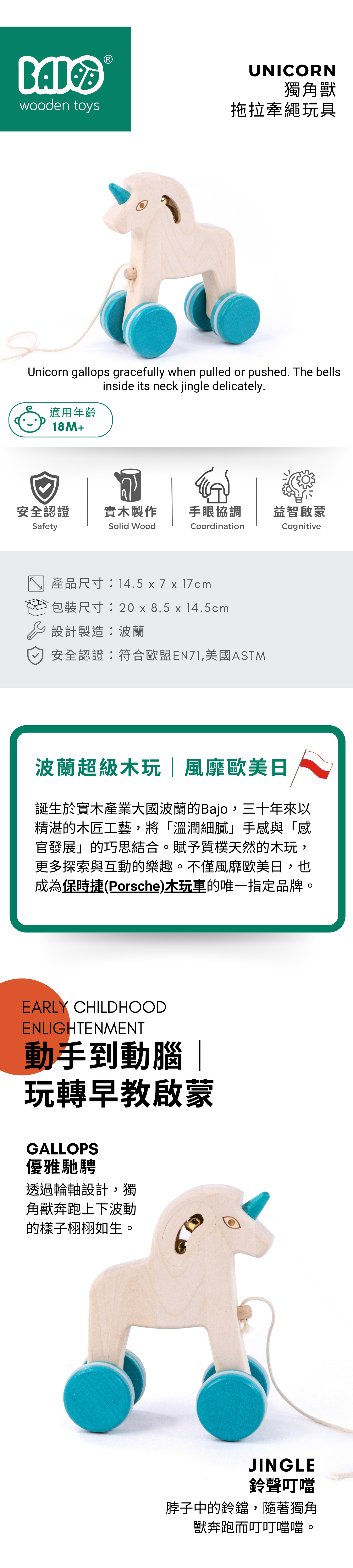 獨角獸拉繩玩具內置鈴鐺,推動時會發出清脆聲響,結合童話設計,幫助孩子提升手眼協調、感官發展與想像力,是寓教於樂的完美玩具。