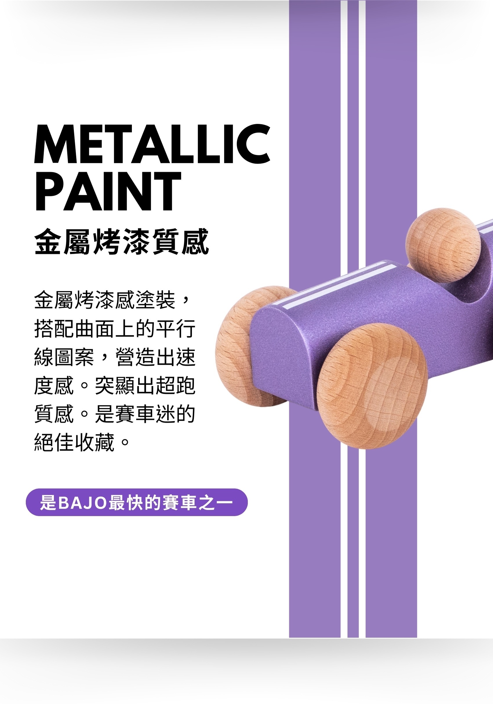 真實跑車的金屬烤漆也可以完美呈現在兒童木玩上!復古車款搭配拉風金屬色,愛不釋手的光滑觸感,簡約流線型設計為特色,幫助孩子體驗速度與動力,提升手眼協調能力,激發對賽車的興趣與創造力。