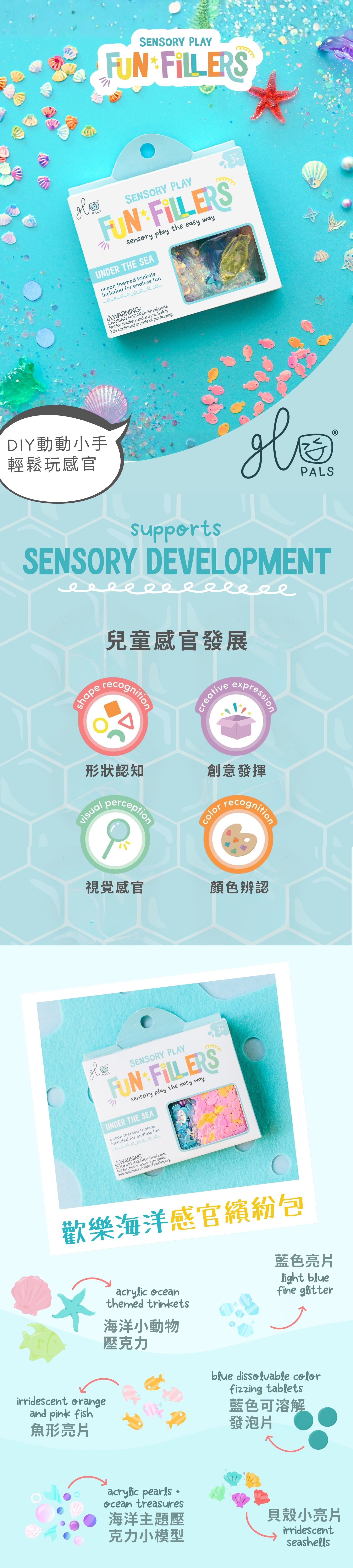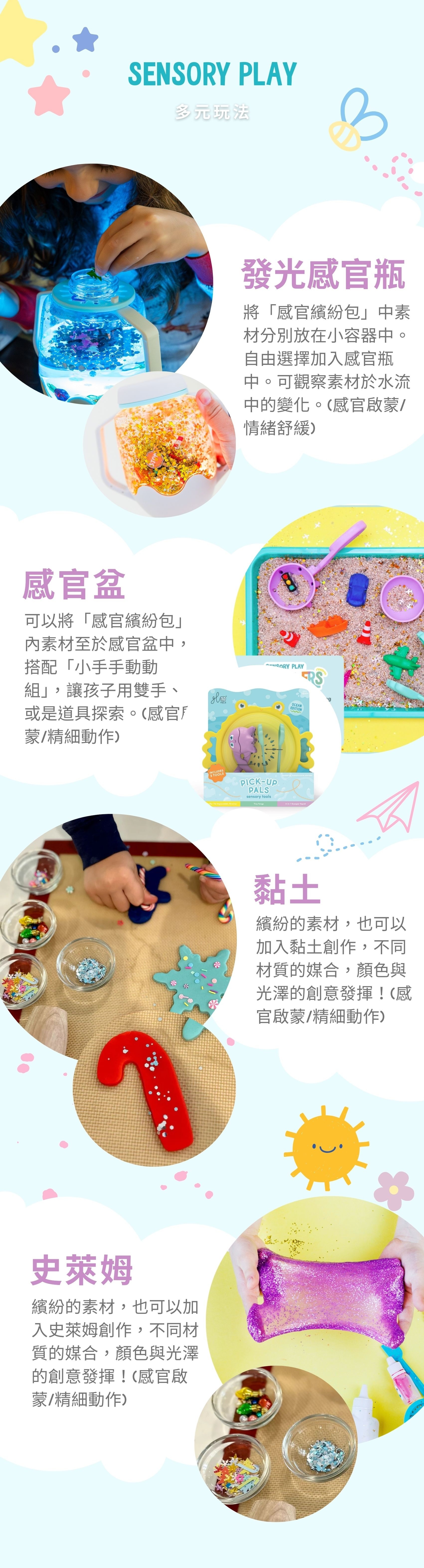 感官繽紛包內含豐富原素,包含亮粉、亮片主題小模型等小物,內由小包分裝。可搭配感官瓶/盆、黏土或史萊姆使用。(不可放入口鼻眼,需大人陪同使用),開啟孩子的感官與創意之旅。將可愛的繽紛元素加入各種感官遊戲,提供不同材質的觸覺、視覺的感官接收。並讓孩子自由發揮創意,讓孩子自主選擇、自由創造屬於自己的繽紛作品。