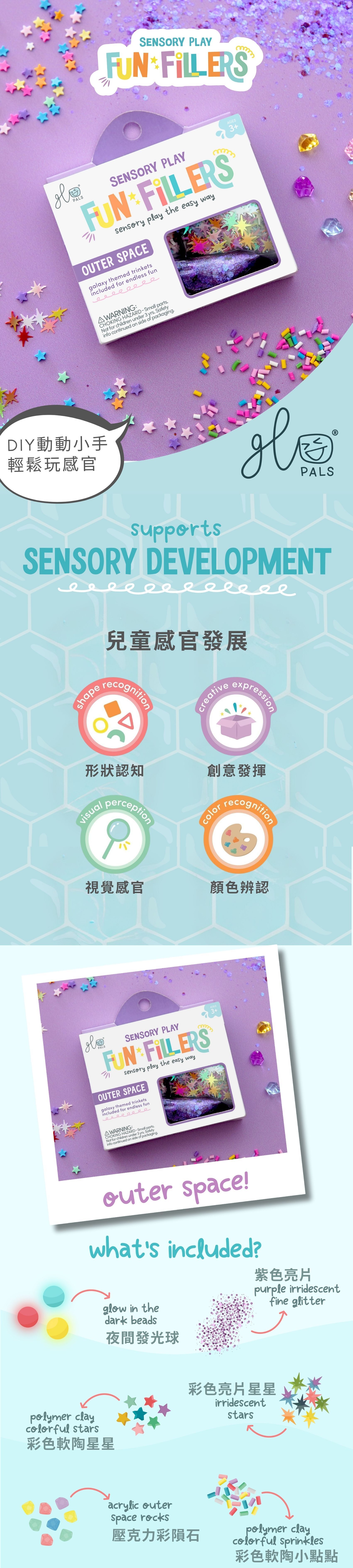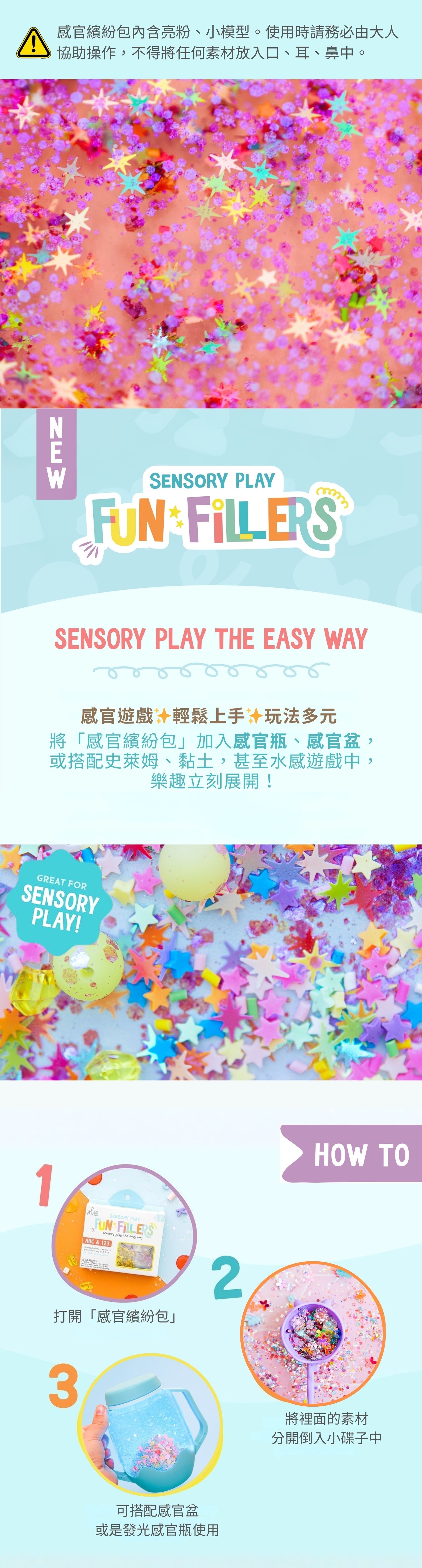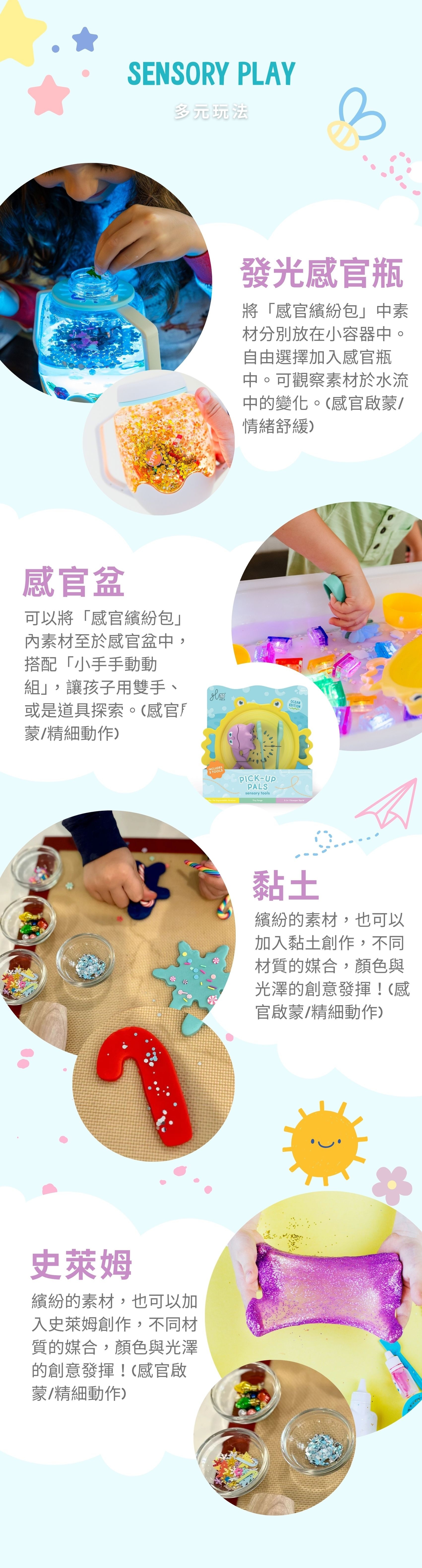 感官繽紛包內含豐富原素,包含亮粉、亮片主題小模型等小物,內由小包分裝。可搭配感官瓶/盆、黏土或史萊姆使用。(不可放入口鼻眼,需大人陪同使用),開啟孩子的感官與創意之旅。將可愛的繽紛元素加入各種感官遊戲,提供不同材質的觸覺、視覺的感官接收。並讓孩子自由發揮創意,讓孩子自主選擇、自由創造屬於自己的繽紛作品。