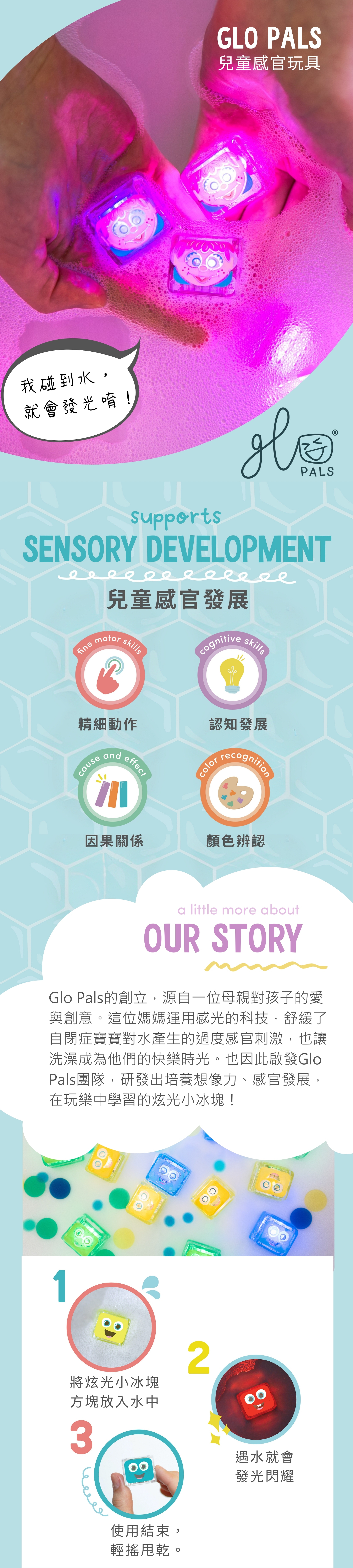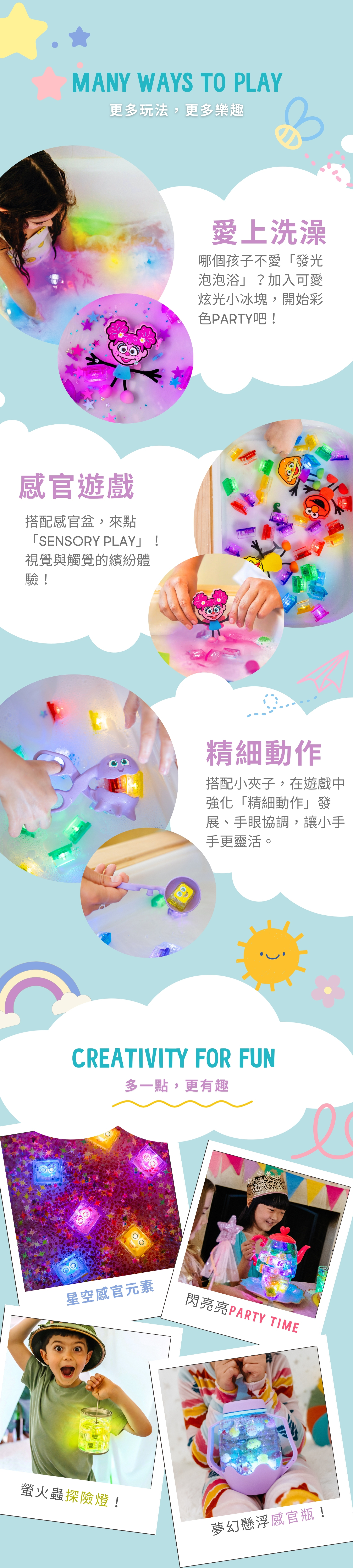 遇水發亮的炫光小冰塊,讓孩子愛上洗澡!發光感應靈敏,遇水即亮、出水即滅。幫助低幼寶寶因果關係的聯想訓練,與小手手精細動作的抓握訓練!