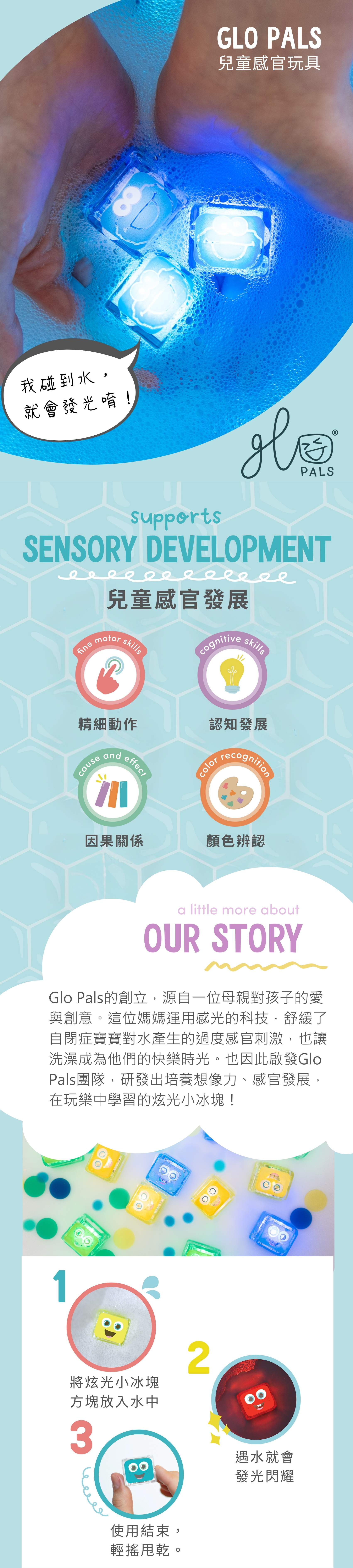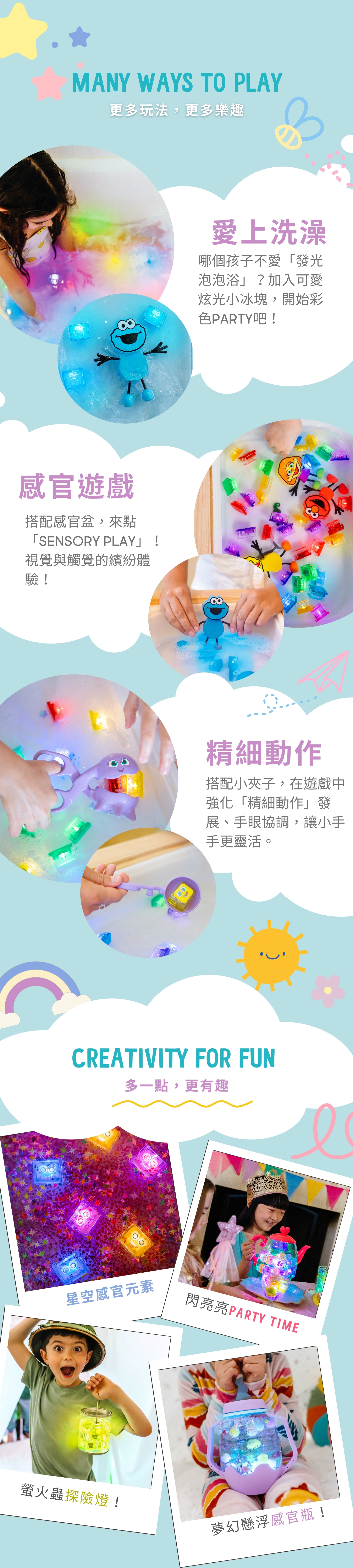 遇水發亮的炫光小冰塊,讓孩子愛上洗澡!發光感應靈敏,遇水即亮、出水即滅。幫助低幼寶寶因果關係的聯想訓練,與小手手精細動作的抓握訓練!