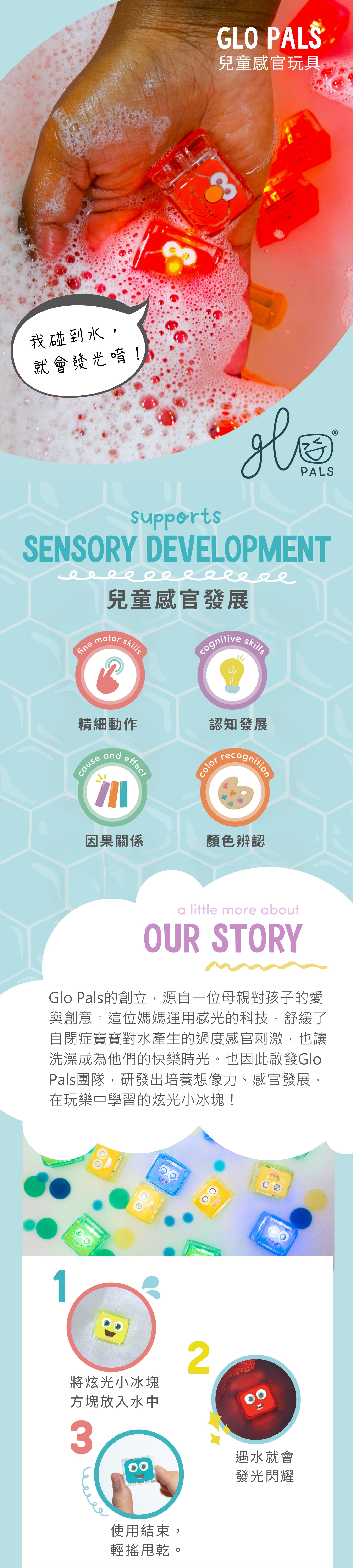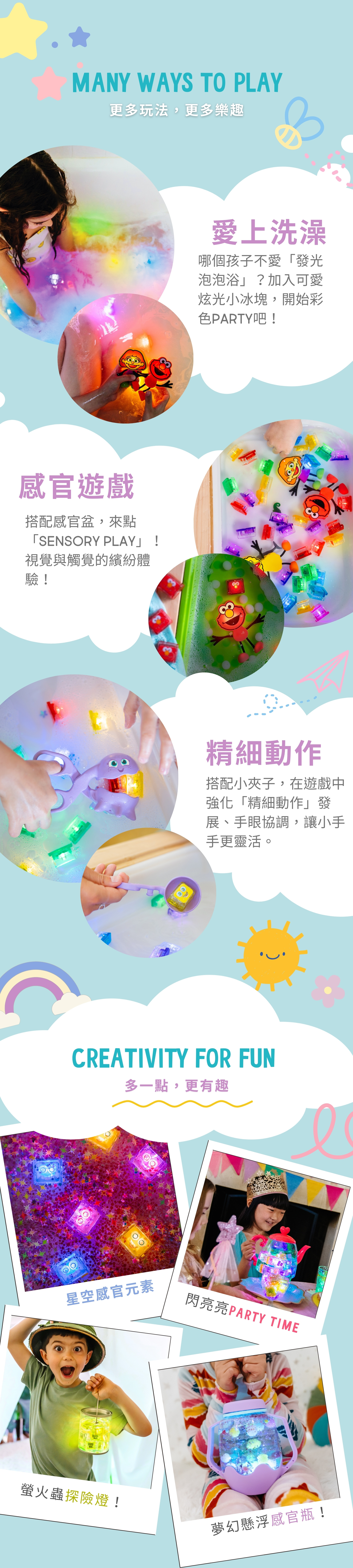 遇水發亮的炫光小冰塊,讓孩子愛上洗澡!發光感應靈敏,遇水即亮、出水即滅。幫助低幼寶寶因果關係的聯想訓練,與小手手精細動作的抓握訓練!
