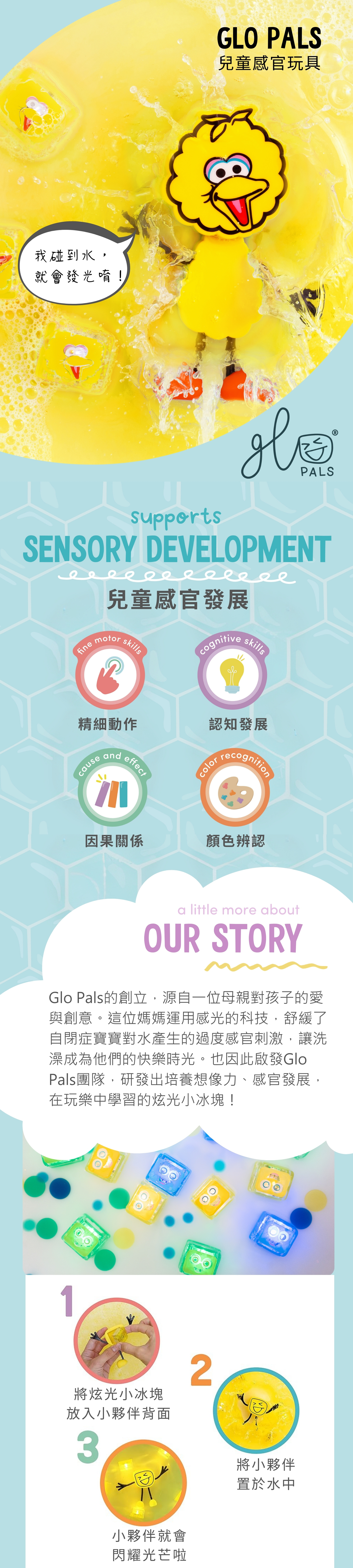 遇水發亮的炫光小冰塊,搭配炫光小夥伴,讓孩子愛上洗澡!發光感應靈敏,遇水即亮、出水即滅。幫助低幼寶寶因果關係的聯想訓練,小手手的精細動作抓握訓練!