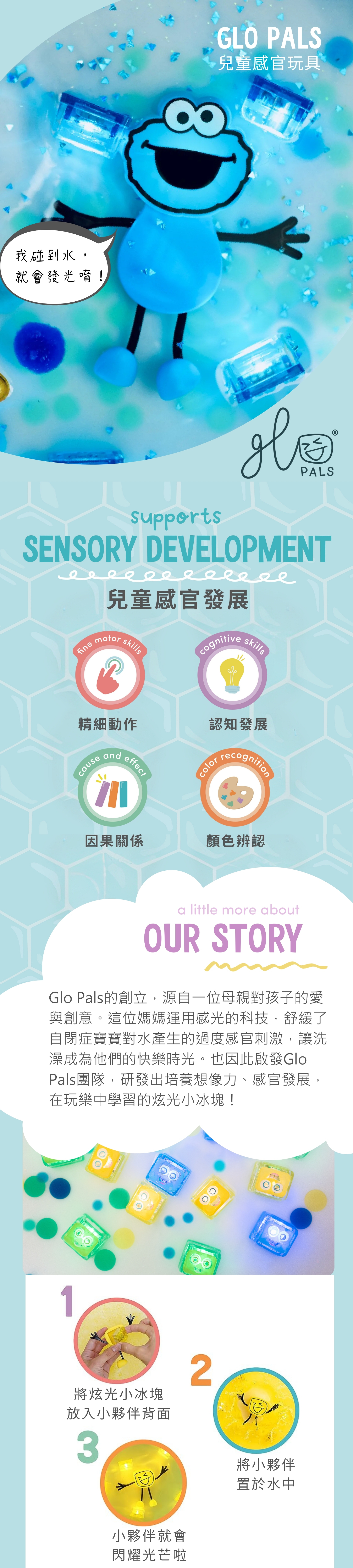 遇水發亮的炫光小冰塊,搭配炫光小夥伴,讓孩子愛上洗澡!發光感應靈敏,遇水即亮、出水即滅。幫助低幼寶寶因果關係的聯想訓練,小手手的精細動作抓握訓練!
