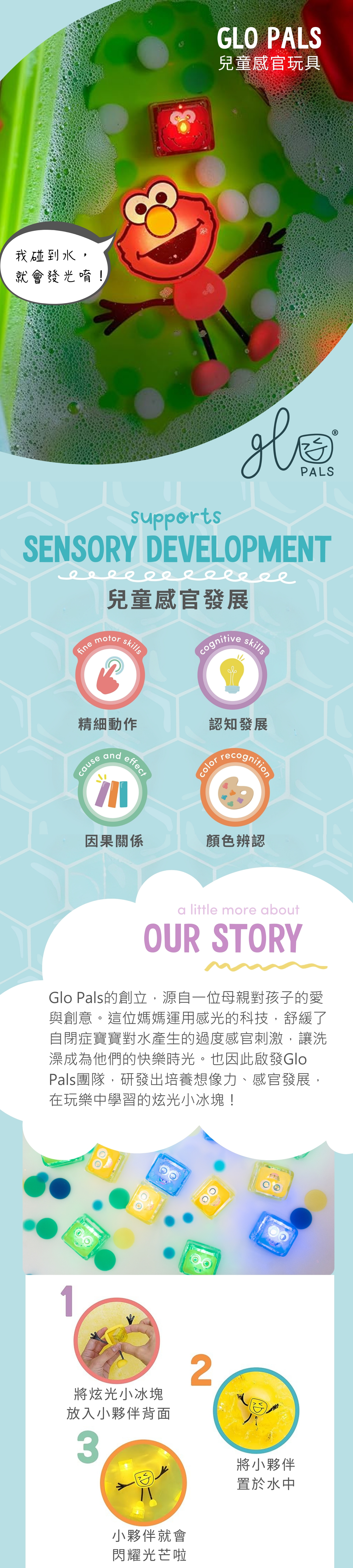 遇水發亮的炫光小冰塊,搭配炫光小夥伴,讓孩子愛上洗澡!發光感應靈敏,遇水即亮、出水即滅。幫助低幼寶寶因果關係的聯想訓練,小手手的精細動作抓握訓練!