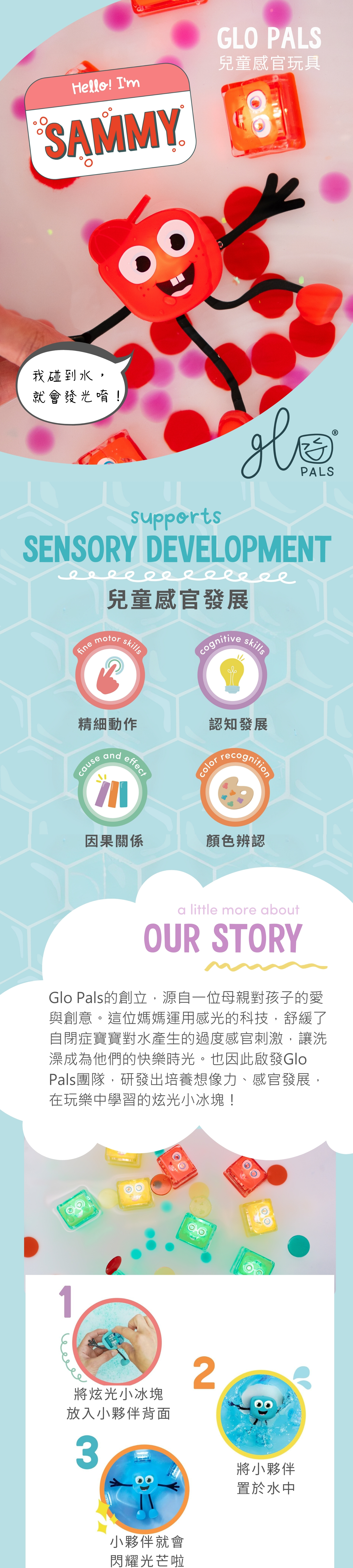 遇水發亮的炫光小冰塊,搭配炫光小夥伴,讓孩子愛上洗澡!發光感應靈敏,遇水即亮、出水即滅。幫助低幼寶寶因果關係的聯想訓練,小手手的精細動作抓握訓練!