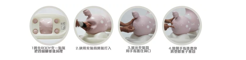 ◆先將RODY小馬尾部塞子拔出,讓RODY處於空氣半滿的狀態,將四隻腳塞進搖板的洞裡。
